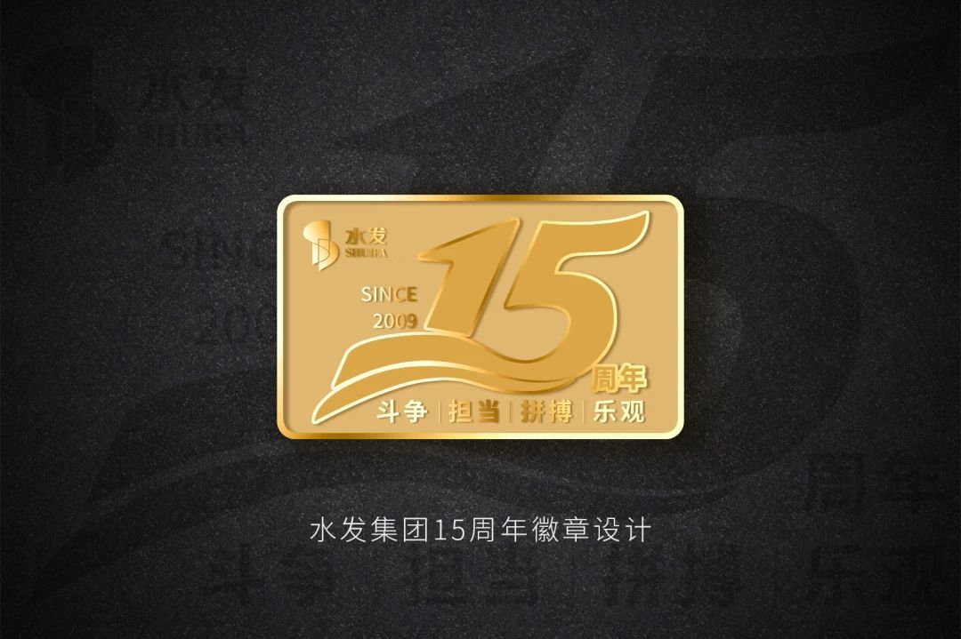 水發(fā)集團(tuán)因水而興,從2009至2024年已走過(guò)15個(gè)春秋,數(shù)字“15”結(jié)合流動(dòng)的水來(lái)設(shè)計(jì),并結(jié)合了“斗爭(zhēng)、擔(dān)當(dāng)、拼搏、樂觀”的新水發(fā)精神,金色的徽章更顯品質(zhì)。